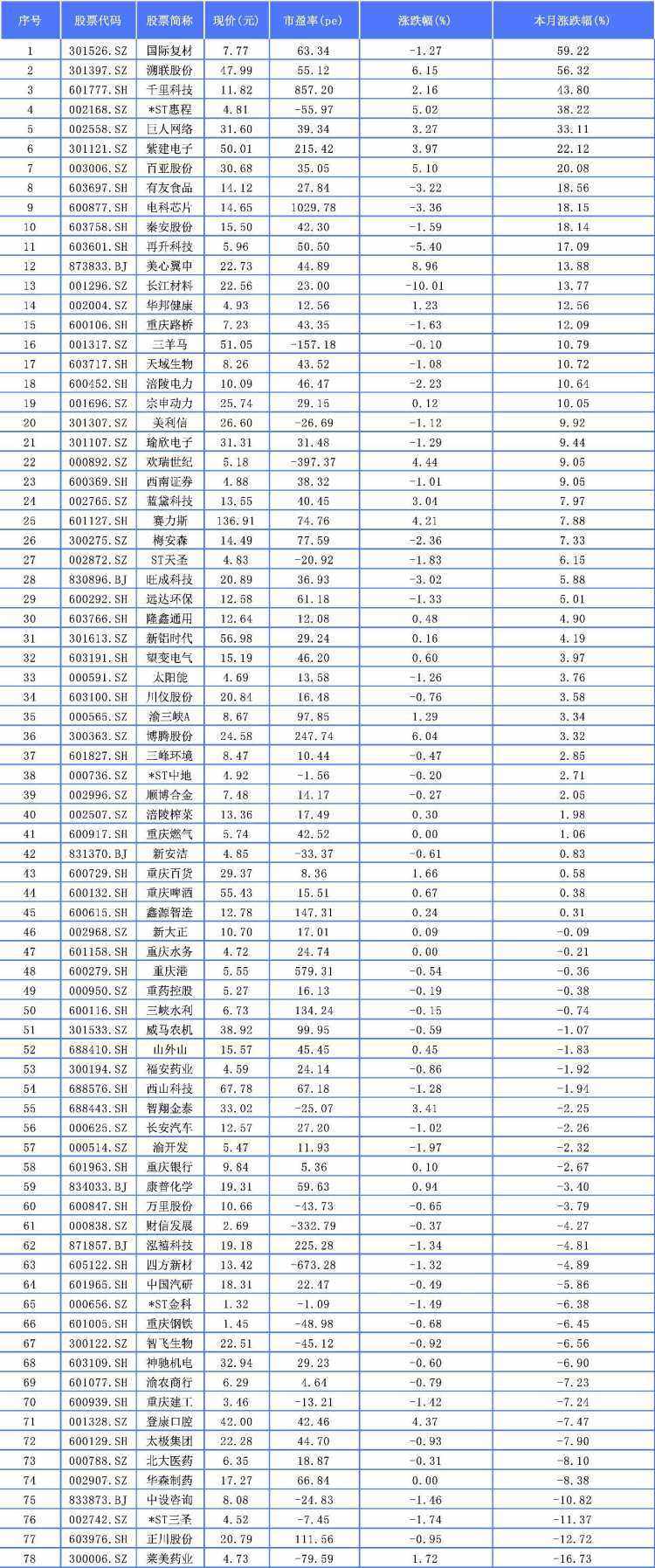 下跌重庆A股共有33家,其中*ST三圣、正川股份和莱美药业分别以-11.37%、-12.72%和-16.73%,列本月渝股涨幅最后三位。