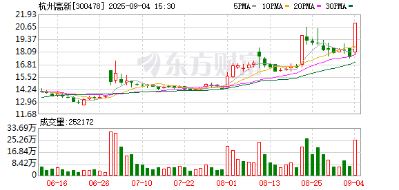 9月4日,杭州高新逆市大涨,开盘不久后即封住20cm涨停。截至当日收盘,杭州高新股价为21.01元/股,涨幅为19.99%。