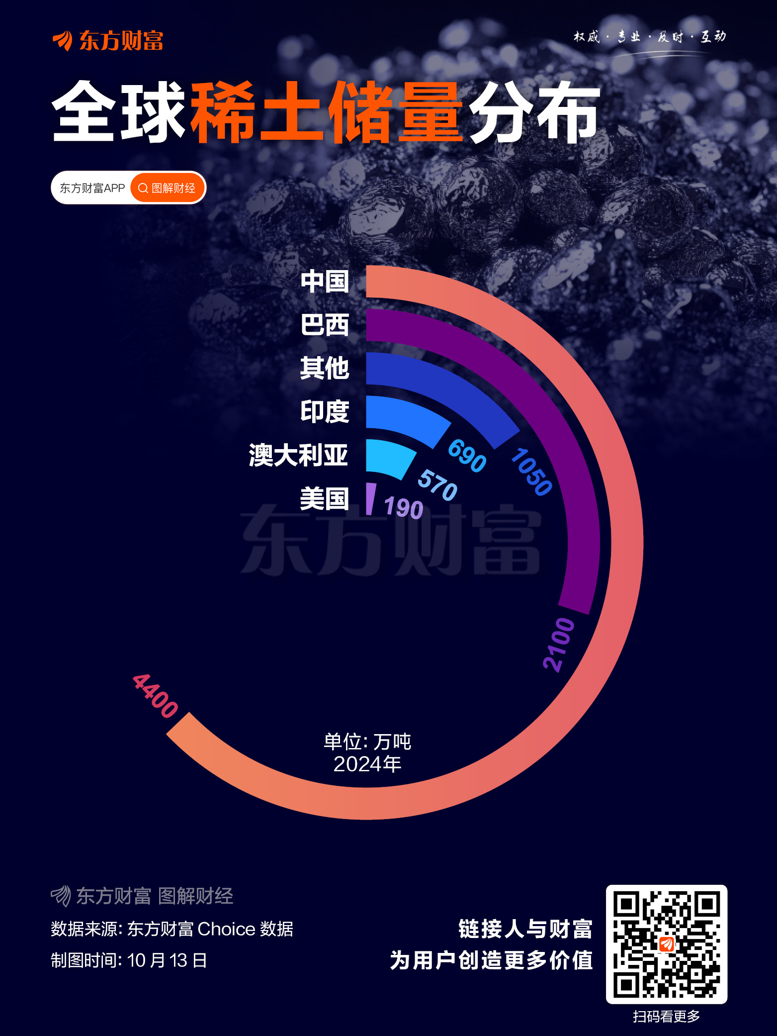 数据显示,我国稀土储量全球第一,2024年全球稀土储量达9000万吨,中国储量4400万吨,占比49%,位列第一。巴西储量2100万吨,印度储量690万吨位列二、三。美国储量为190万吨,不足中国的1/20。