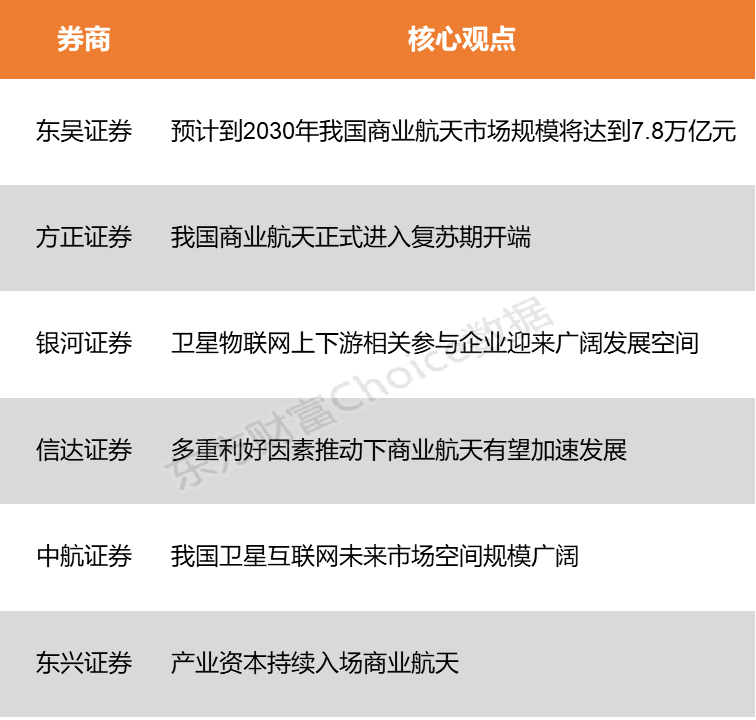 东吴证券表示,对标美国SpaceX2016~2025十年间市值增长约40倍至4000亿美元,国内商业航天核心产业链环节亦有望孕育出百亿甚至千亿估值的本土龙头。方正证券指出,我国商业航天正式进入复苏期开端,后势强劲,产业加速期已经到来。