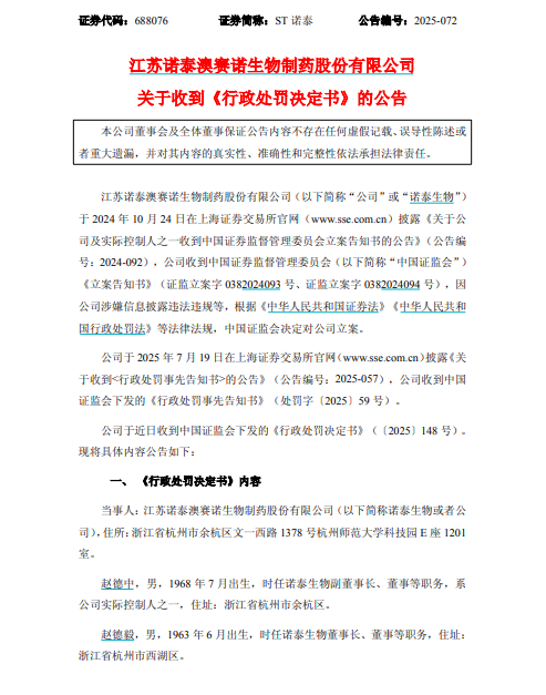 12月17日晚间,江苏诺泰澳赛诺生物制药股份有限公司(688076.SH)发布关于收到《行政处罚决定书》的公告。公告显示,中国证监会调查认定,ST诺泰在上市首年即通过一笔缺乏商业实质的技术转让交易虚增利润,粉饰报表,并基于此虚假财务数据成功实施可转债发行,最终因信息披露违法违规及欺诈发行行为,公司及相关责任人总计被处以7320万元罚款。与此同时,上海证券交易所对ST诺泰及相关人员予以公开谴责,并限制其五年内再融资资格。此次处罚也为近期持续发酵的ST诺泰信披违规案画上了阶段性句号。