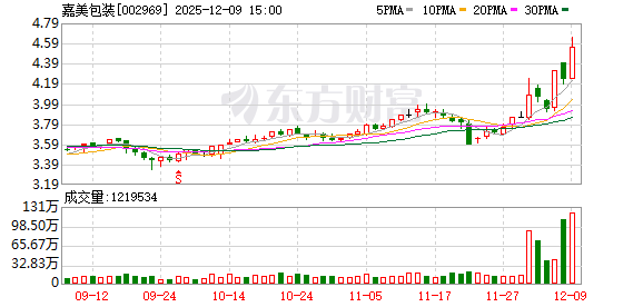 12月19日,嘉美包装(002969.SZ)连续第三天涨停,连续3个交易日收盘价格涨幅偏离值累计超过20%。消息层面上,扫地机器人企业追觅的创始人俞浩近日拟以20多亿元收购嘉美包装的控股权。