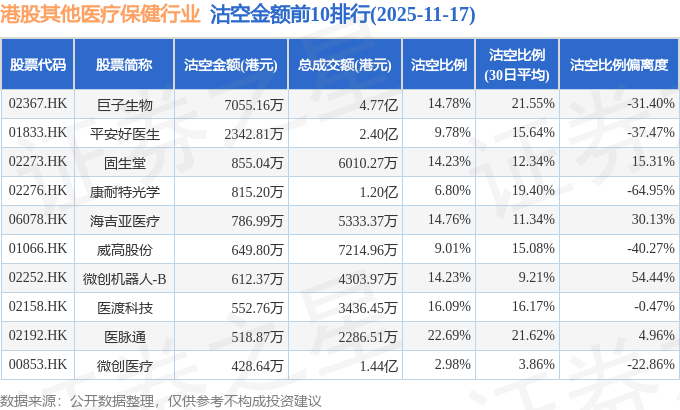 11月17日港股其他医疗保健行业沽空数据盘点,巨子生物、平安好医生、固生堂沽空金额位居行业前三
