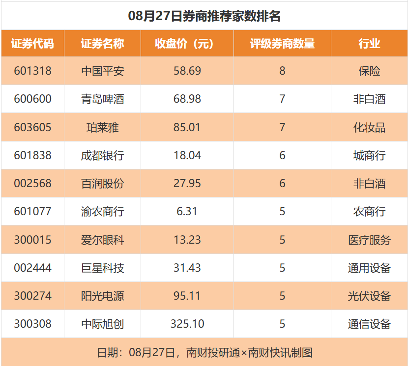 从券商推荐家数来看,8月27日有307家上市公司得到券商推荐,其中中国平安获得8家推荐,青岛啤酒获得7家推荐,珀莱雅获得7家推荐。