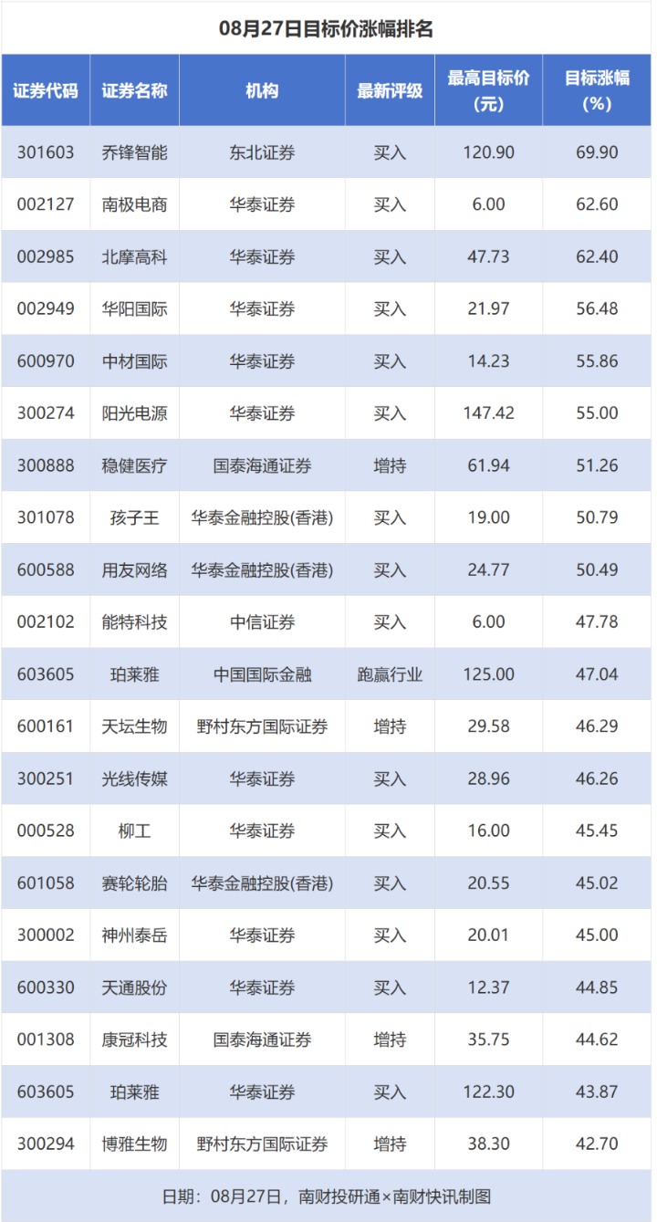 南财投研通数据显示,8月27日,券商给予上市公司目标价共201次,按最新收盘价计算,目标价涨幅排名居前的公司有乔锋智能、南极电商、北摩高科,目标价涨幅分别为69.90%、62.60%、62.40%,分别属于通用设备、互联网电商、航空装备行业。