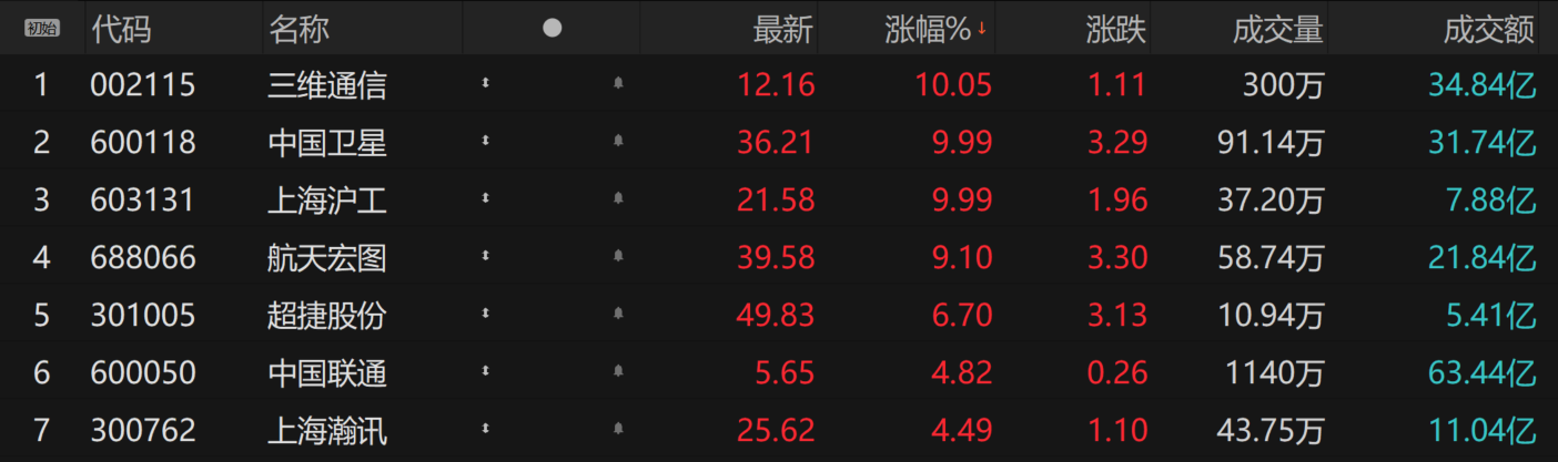 受该消息影响,今日午后卫星互联网概念再度走强。截至收盘,三维通信、中国卫星、上海沪工等多股涨停,航天宏图涨超9%,中国联通涨超4%,超捷股份、上海瀚讯等跟涨。